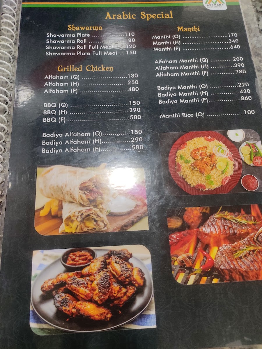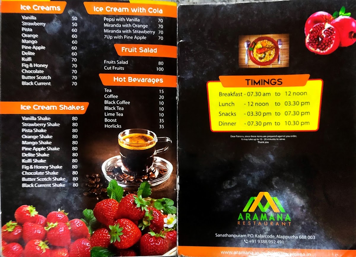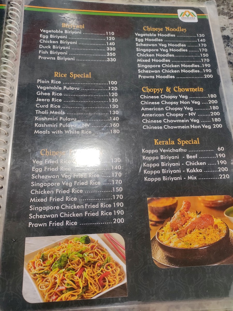 The menu also highlights popular local and regional dishes, including multiple biryani preparations, seafood items like Karimeen Roast and Prawns, traditional Kerala meals, and beverages such as fresh fruit juices and grape juice. Items like Kerala Parotta, Appam with Egg Curry, and fish curries reflect the Kerala culinary influence.