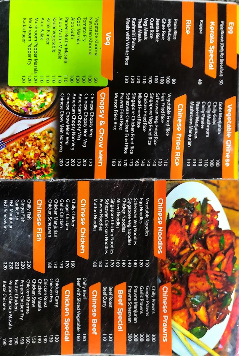 The menu offers a diverse selection of dishes spanning multiple cuisines, including Indian, Kerala, Chinese, and Barbecue specialties. It is structured into various categories to cater to different meal times and preferences, from breakfast options to full meals and light bites.